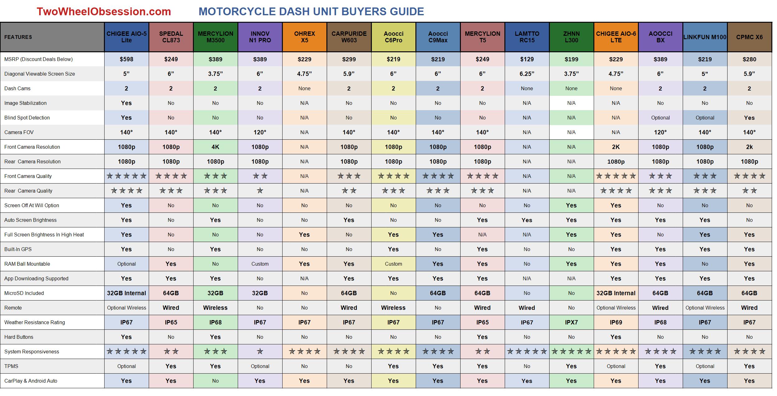 These are all the motorcycle CarPlay / Android Auto dash units I have reviewed to date, with feature listings and notes about important considerations for each. All ratings are relative to the units sampled. Any future reviews will be added as they are completed.